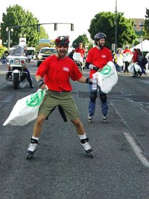 know what it would be from onemoment to the next, but that didn't keep this group of diehard skaters from our annual tradition. The streets were mostly dry by the time we skated back along the parade route to the starting point after handing out the SOLV garbage bags. We were well received by the public and I heard many comments about what a great idea it was for us volunteers to be on skates, and how they (parade watchers) wished they had thought of bringing their skates. What a great way to promote our activity and gain positive publicity! Maria |